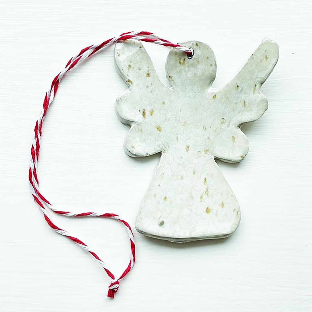 Håndlavet engleophæng i stentøj med hvid glasur og rød-hvid snor. Perfekt som julepynt eller en særlig dekoration året rundt. Hvert ophæng er unikt.