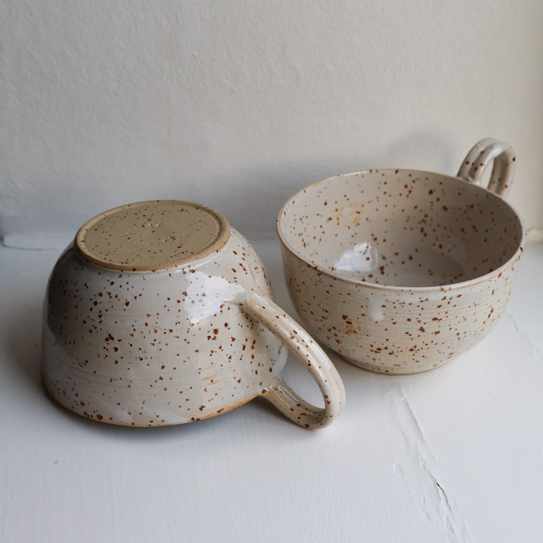 Hånddrejet lattekop med hank. Drejet i stentøjsler med lava.