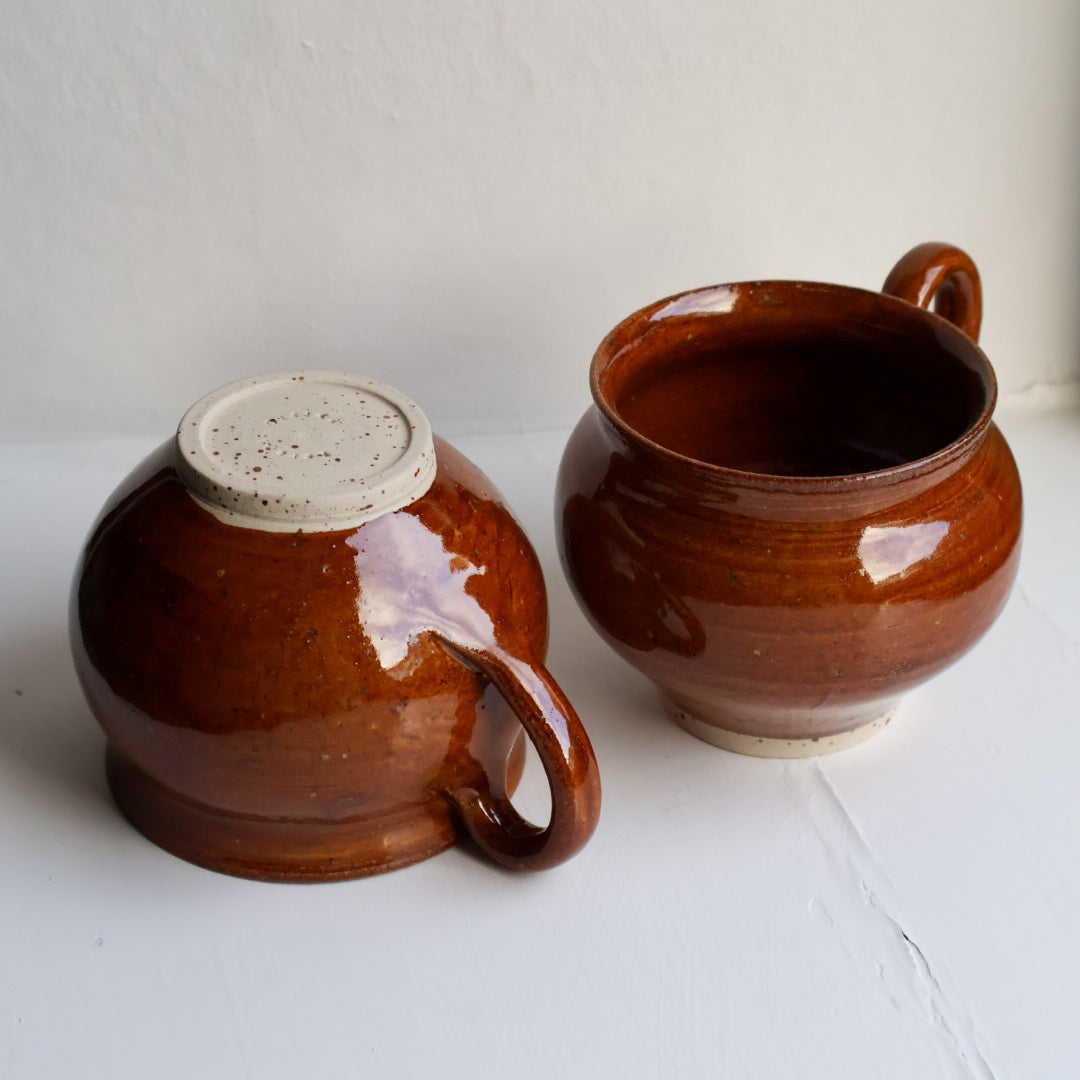 Hånddrejet kop med hank. Drejet i stentøjsler med lava.