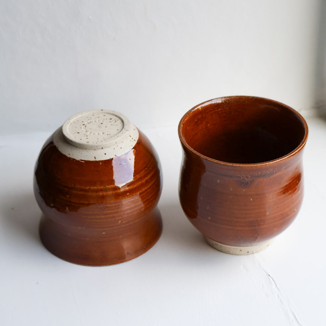 Hånddrejet kop uden hank. Drejet i stentøjsler med lava.