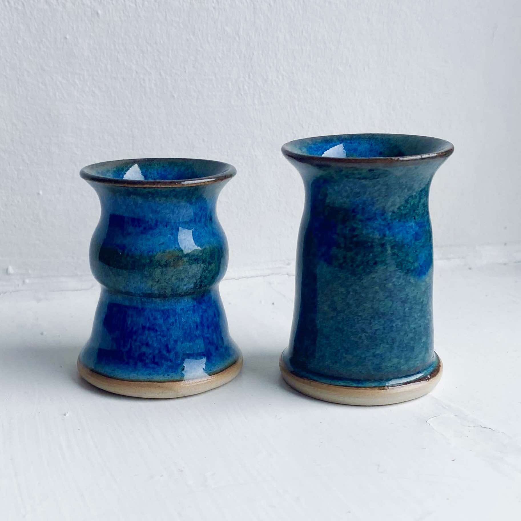 Hånddrejede lysestager i stentøjsler med en dyb blå glasur inspireret af nordiske havbriser. Glasuren skaber et levende farvespil, hvor nuancer af blå og grøn smelter sammen. Stagernes organiske former giver et unikt og harmonisk udtryk.