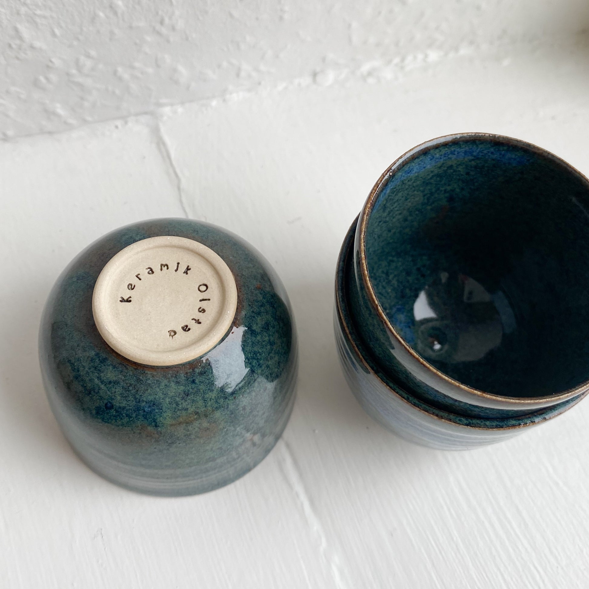 Hånddrejet espressokop uden hank. Drejet i stentøjsler. Blålig glasur med effekter i et minimalistisk udtryk. Koppen er ideel til espresso eller ingefærshot.