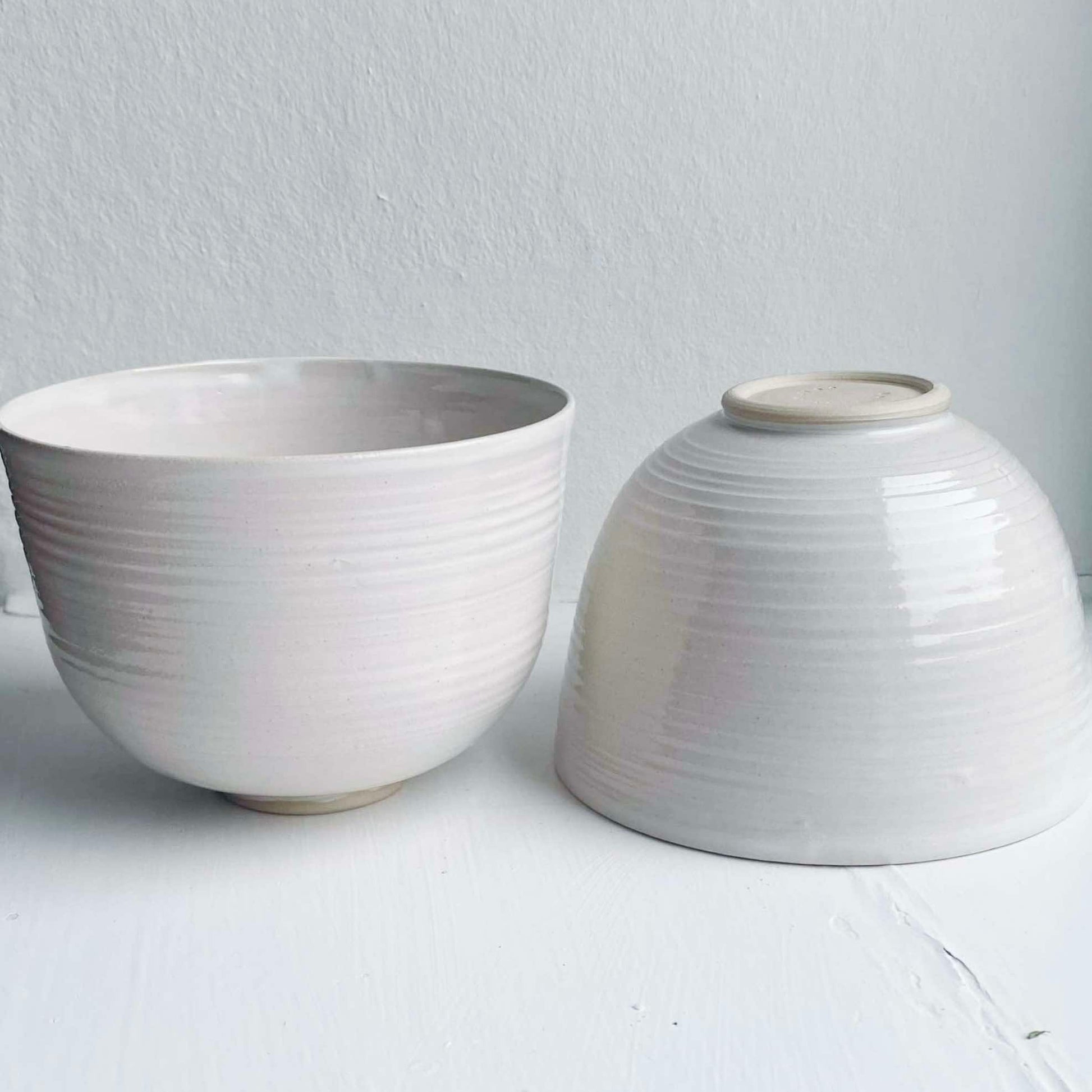 Denne elegante skål fra Rimfrost-serien er drejet i hånden og glaseret i en smuk, blank hvid nuance, der giver et roligt og minimalistisk udtryk. De fine riller på overfladen skaber en subtil tekstur.