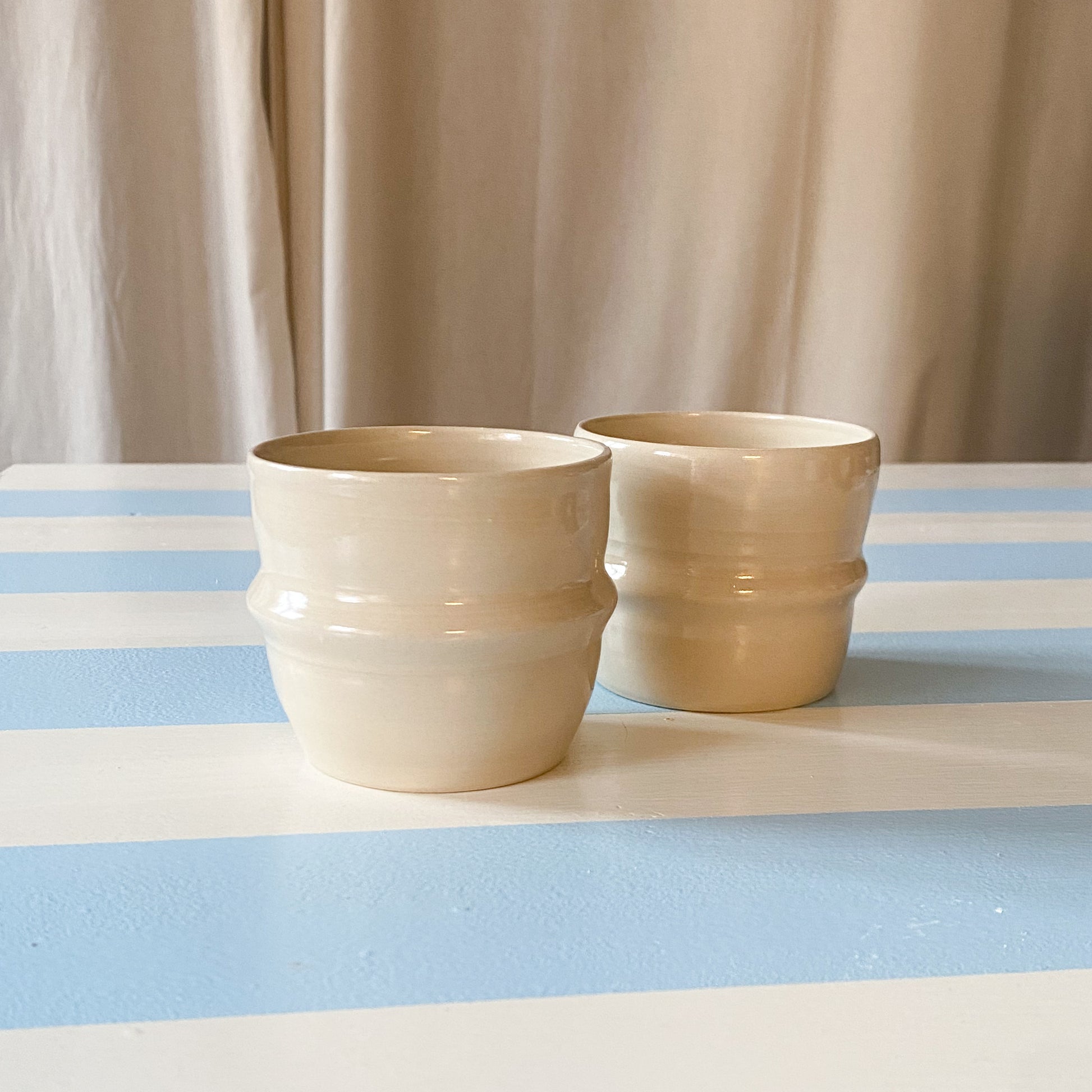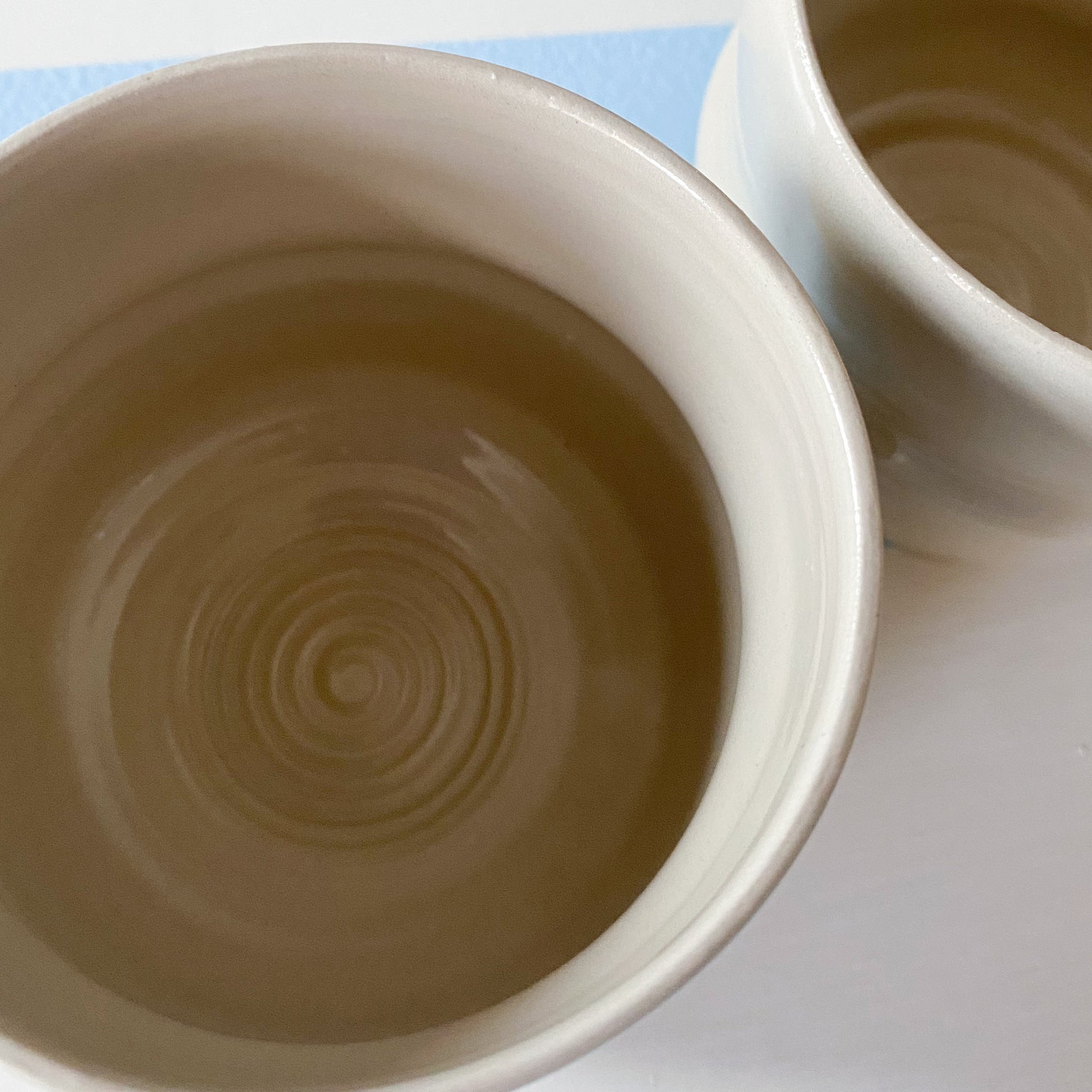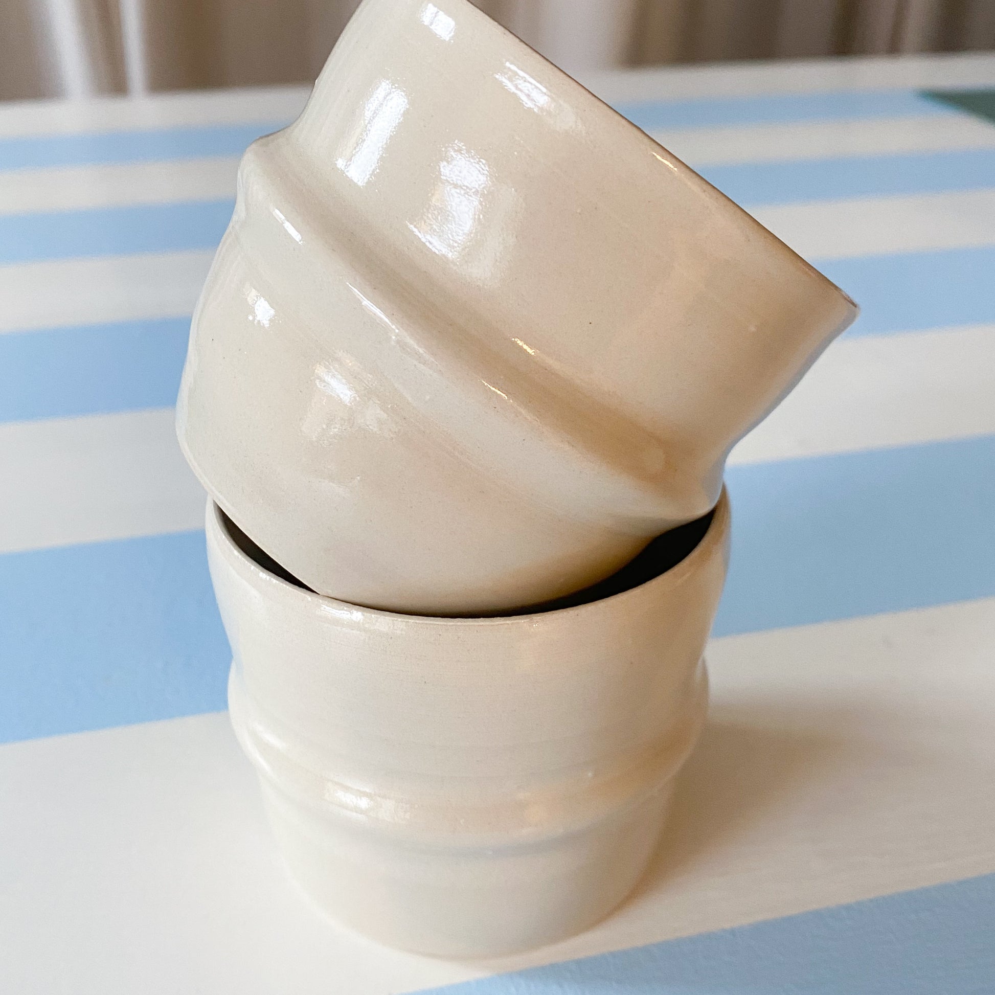 Hånddrejet kop uden hank drejet i stentøjsler. Koppen indbyder til kaffe eller morgenjuice. Koppen fremstår elegant i den blanke men neutrale glasur.