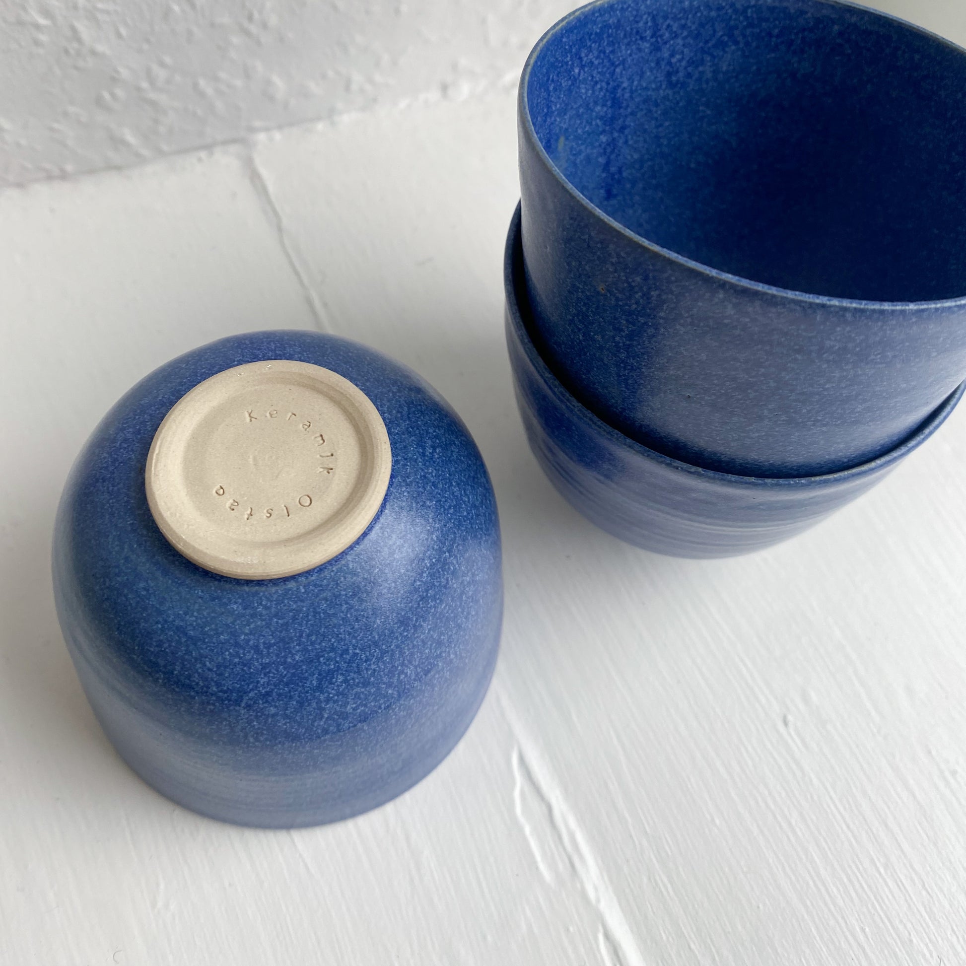 Den blå glasur minder om forårets smukke blomster og fremstår mat og jævn med små effekter i glasuren. Koppen har en behagelig form, der ligger godt i hånden. Koppen indbyder til kaffe eller morgenjuice.