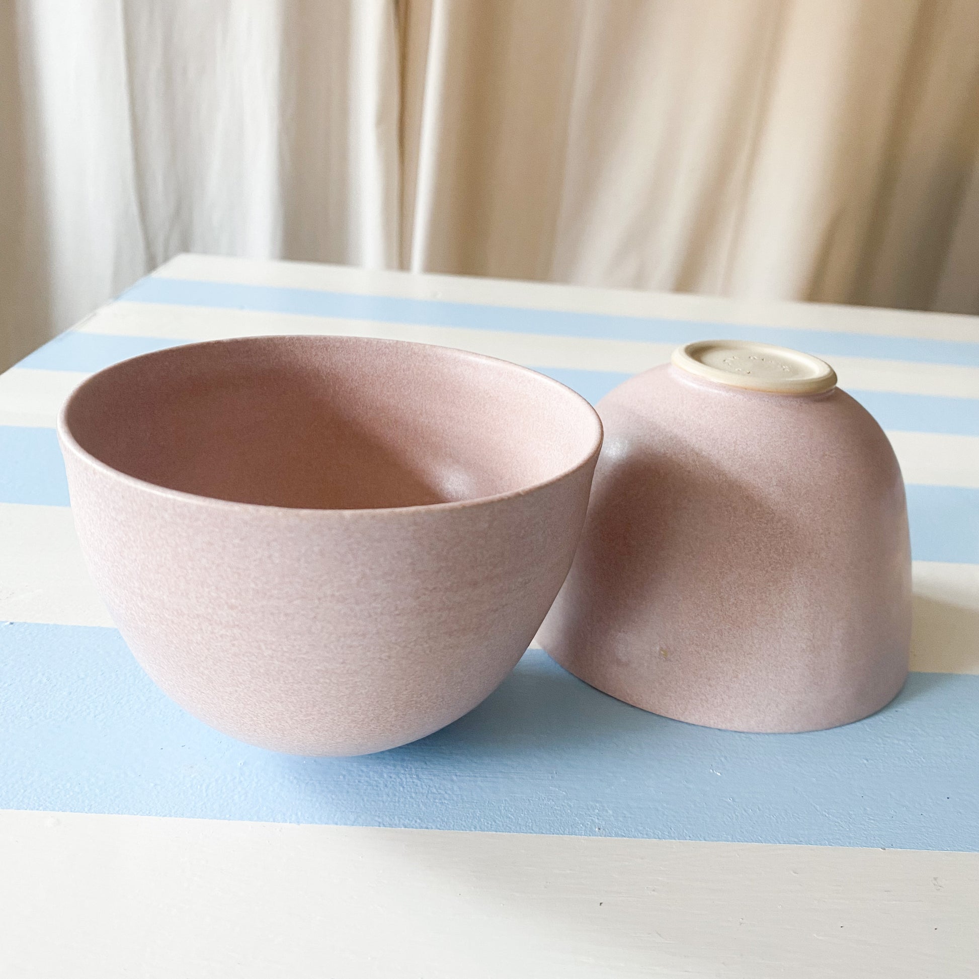 Skålen fremstår let og elegant i en lyserød mat glasur. Skålen er drejet af stentøjsler.